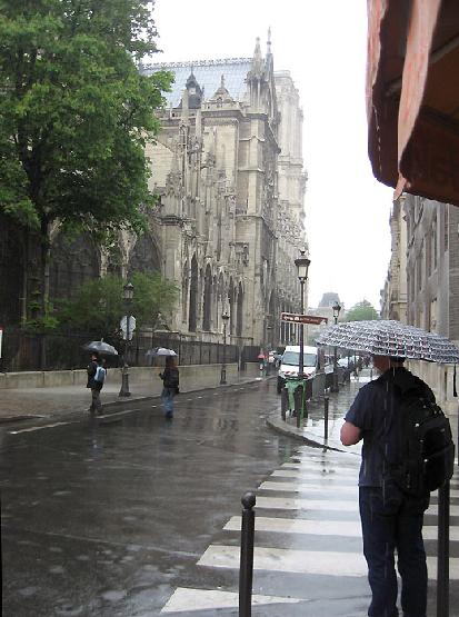 Attached are a few pics to illustrate. Started inauspiciously when we had Euros but not Euro coins for an automated subway/light rail ticket machine, and Brian didn't want to wait in line for the live vendor. So instead sprang for a cab ride in, and were dropped off in a complete deluge at Notre Dame. I had an inadequate windbreaker and Brian nothing, so he ducked into one of the tourist shops (luckily open early Sunday morning) for a cheap umbrella.